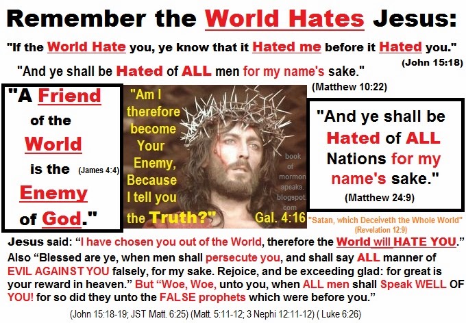 Jesus said: “I have chosen you out of the world, therefore the World will HATE YOU.” Also “Blessed are ye, when men shall persecute you, and shall say ALL manner of EVIL AGAINST YOU falsely, for my sake. Rejoice, and be exceeding glad: for great is your reward in heaven.” But “Woe, Woe, unto you, when ALL men shall Speak WELL OF YOU! for so did they unto the FALSE prophets which were before you.” (John 15:18-19; JST Matt. 6:25) (Matt. 5:11-12; 3 Nephi 12:11-12) ( Luke 6:26)